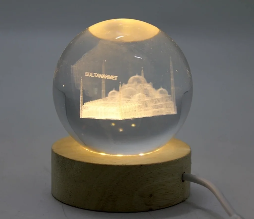 3d Kristal Cam Küre Ahşap Soketli İstanbul Temalı Led Lamba Aalk2574