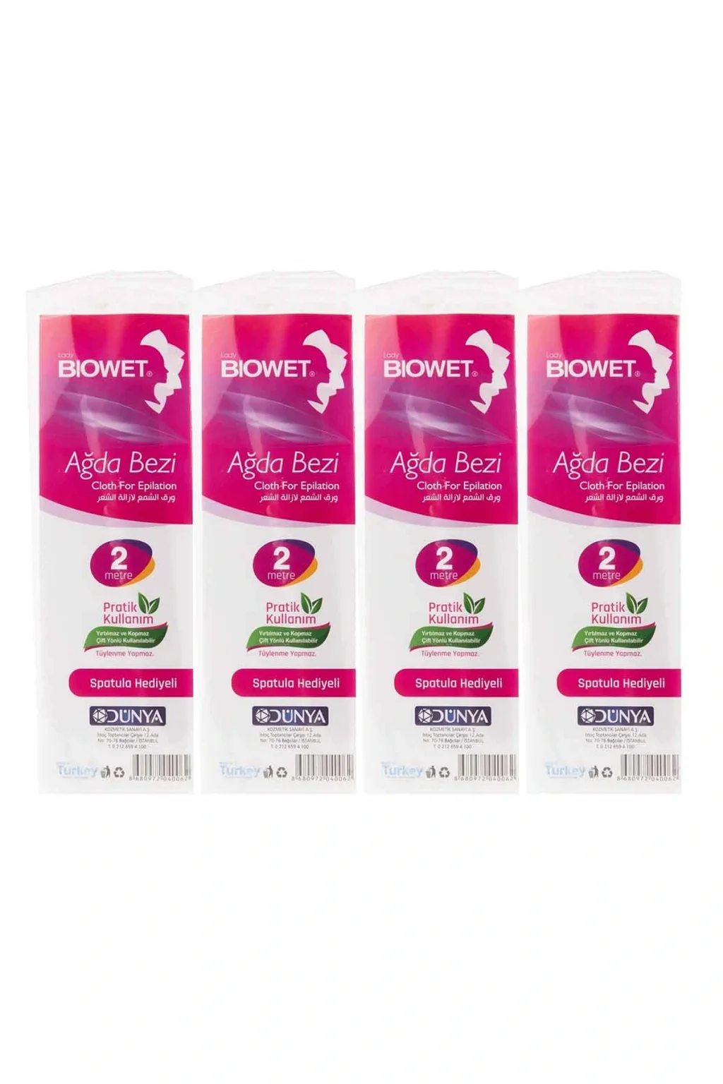| 4 Adet Ağda Bezi 2 Metre Kullanıma Hazır Ağda Bezi Pratik Kullanım Yırtılmaz ve Kopmaz Çift Yönlü Kullanılabilir Tüylenme Yapma Spatula Hediyeli Paket içeriği; 4 Adet 2 Metre Biowet ağda bezi |