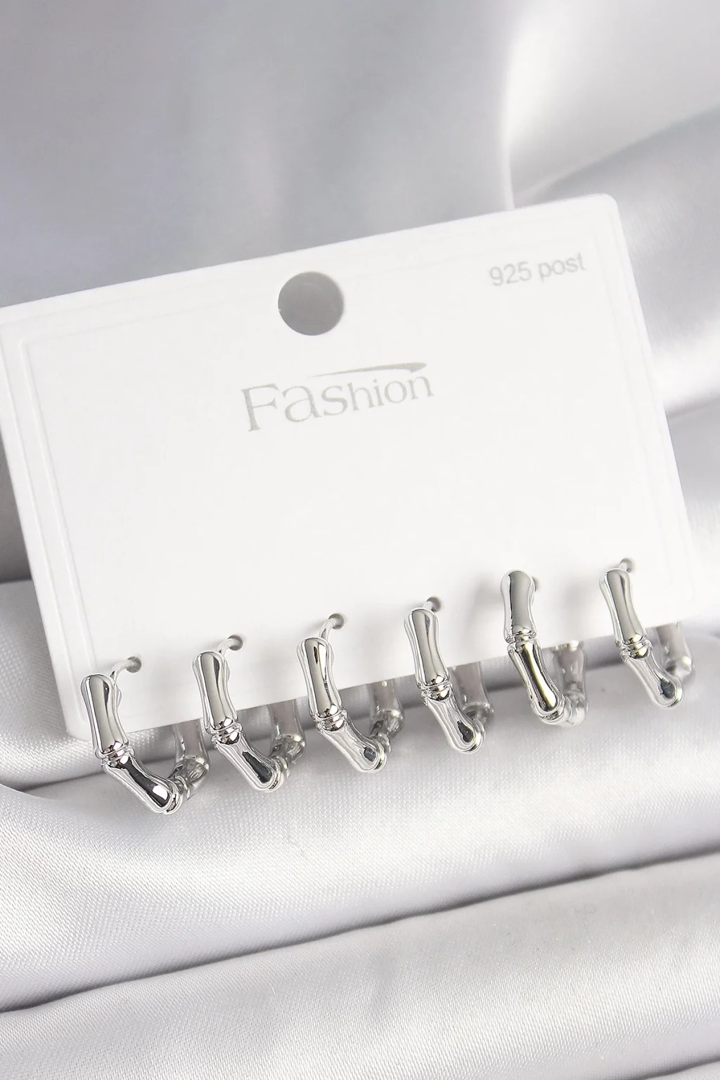 925 Ayar Gümüş Çivi Pirinç Gümüş Renk Bambu Halka Model Kadın Küpe Seti