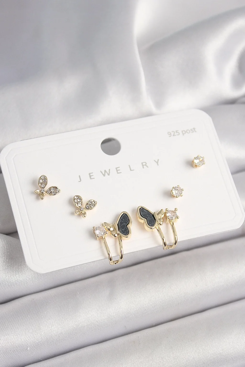 925 Ayar Gümüş Çivi Pirinç Zirkon Taşlı Kelebek Model Kadın Küpe Seti