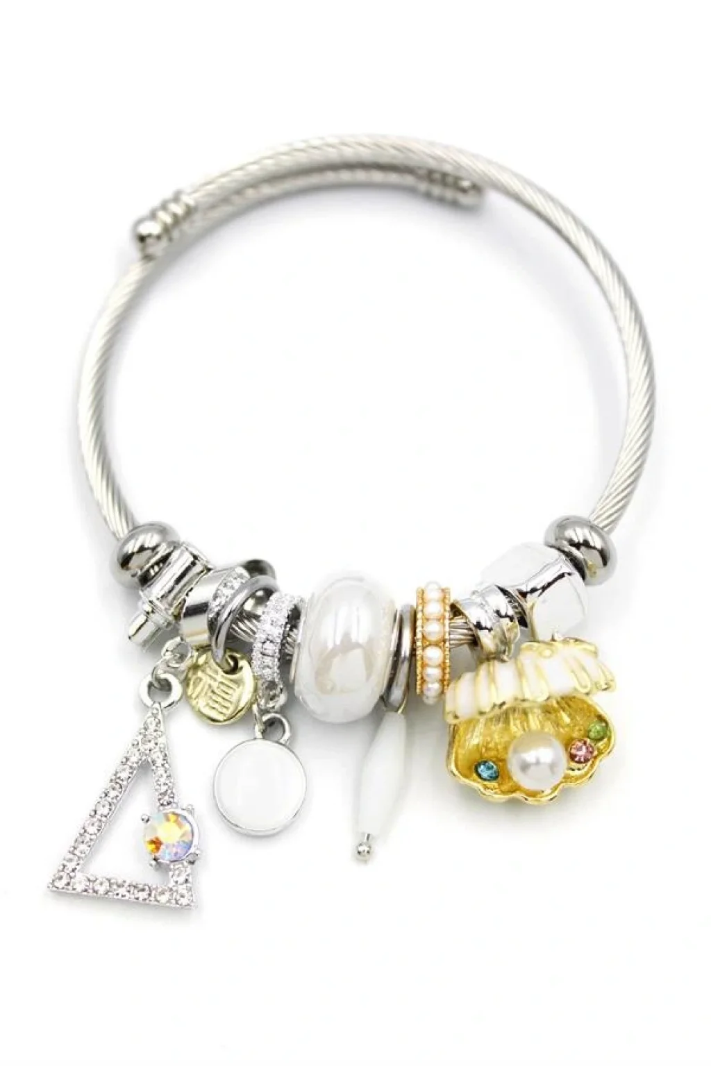 • Çelik Charmlı İncili Deniz Kabuğu Bilezik - Beyaz