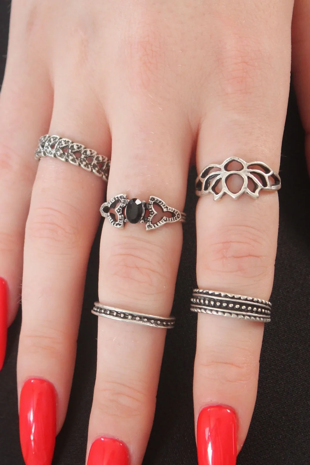Gümüş Renk Lotus Model Siyah Kristal Taş Detay Bayan Yüzük Kombin