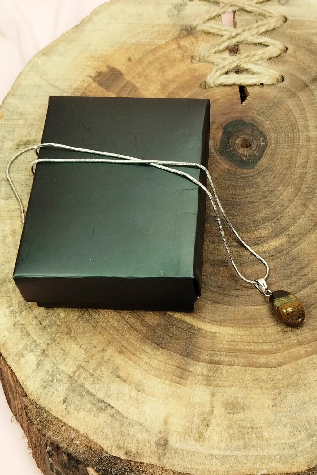 | Kaplan Gözü Doğal Taşı Zincirli El Yapımı Kolye Uç: 2 cm Zincir: 20 cm Kutulu |