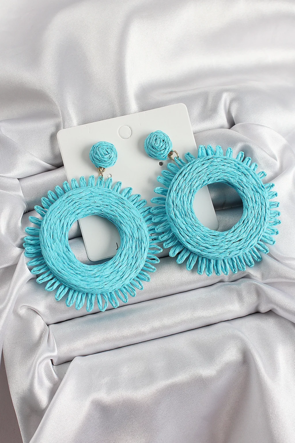 Mavi Püsküllü Halka Figürlü Hasır Örgü Model Gold Renk Kadın Küpe
