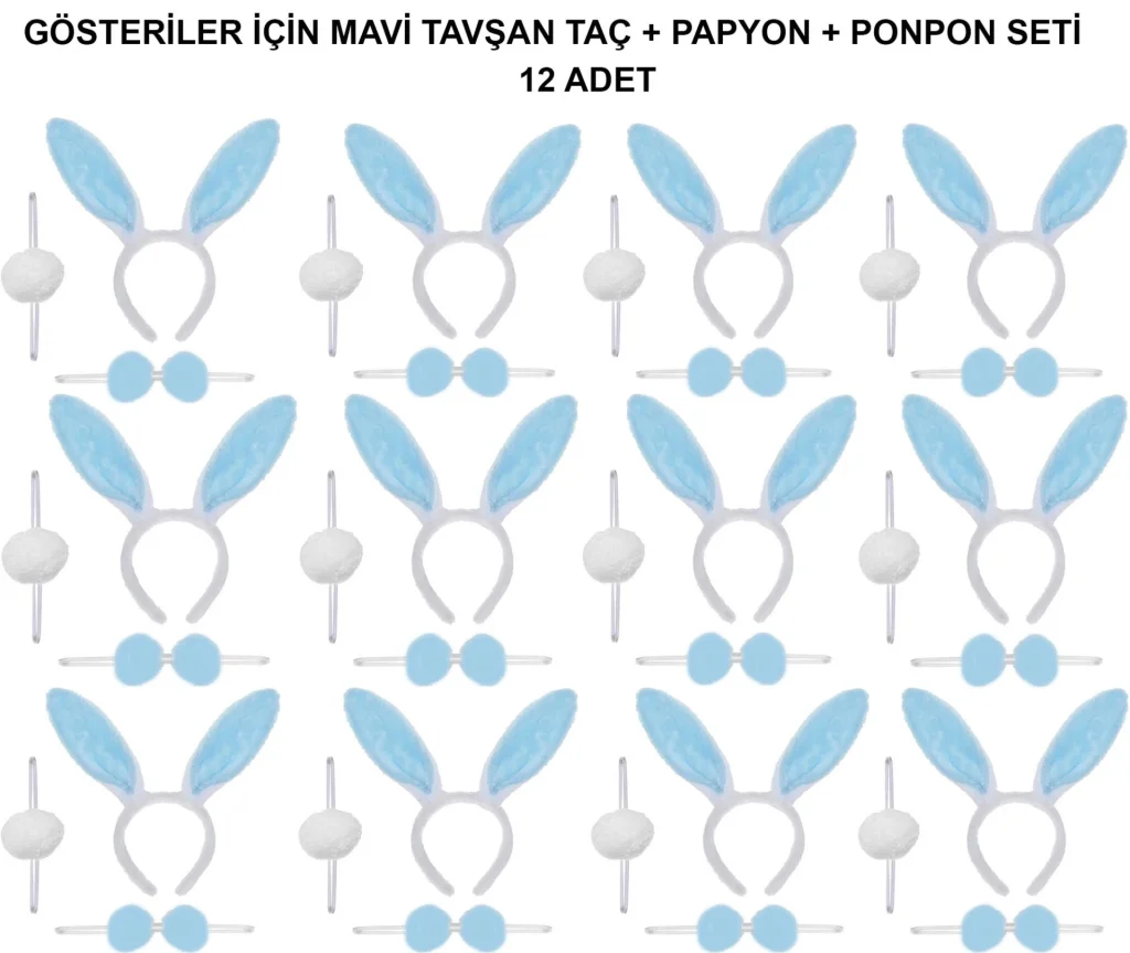 Mavi Tavşan Kostüm Seti – Taç, Papyon, Ponpon (12’li Paket)