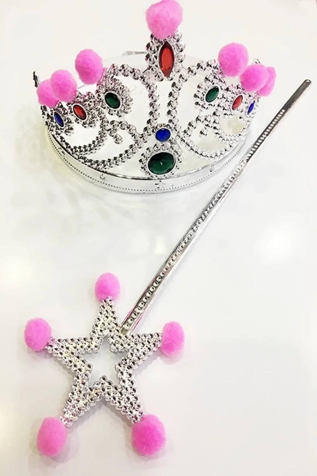 Pembe Ponponlu Gümüş Renk Prenses Tacı Ve Gümüş Renk Prenses Asası