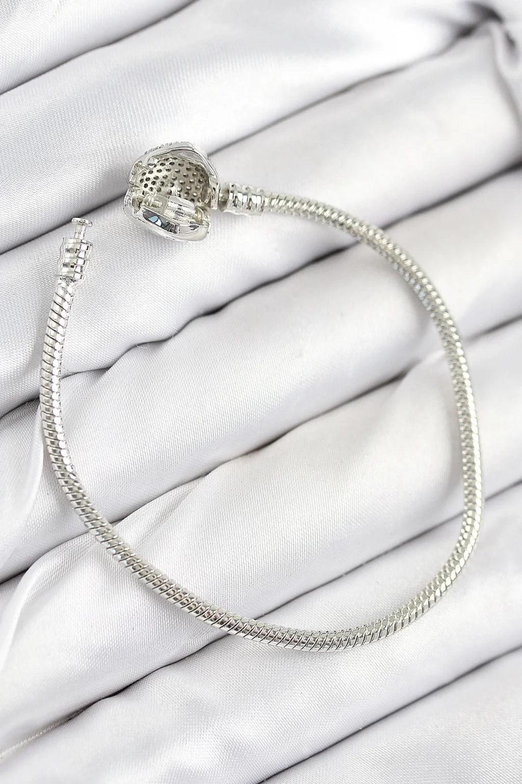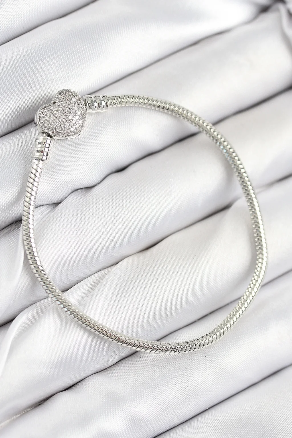 Pirinç Charm Zirkon Taşlı Kalp Model Gümüş Renk Kadın Bileklik