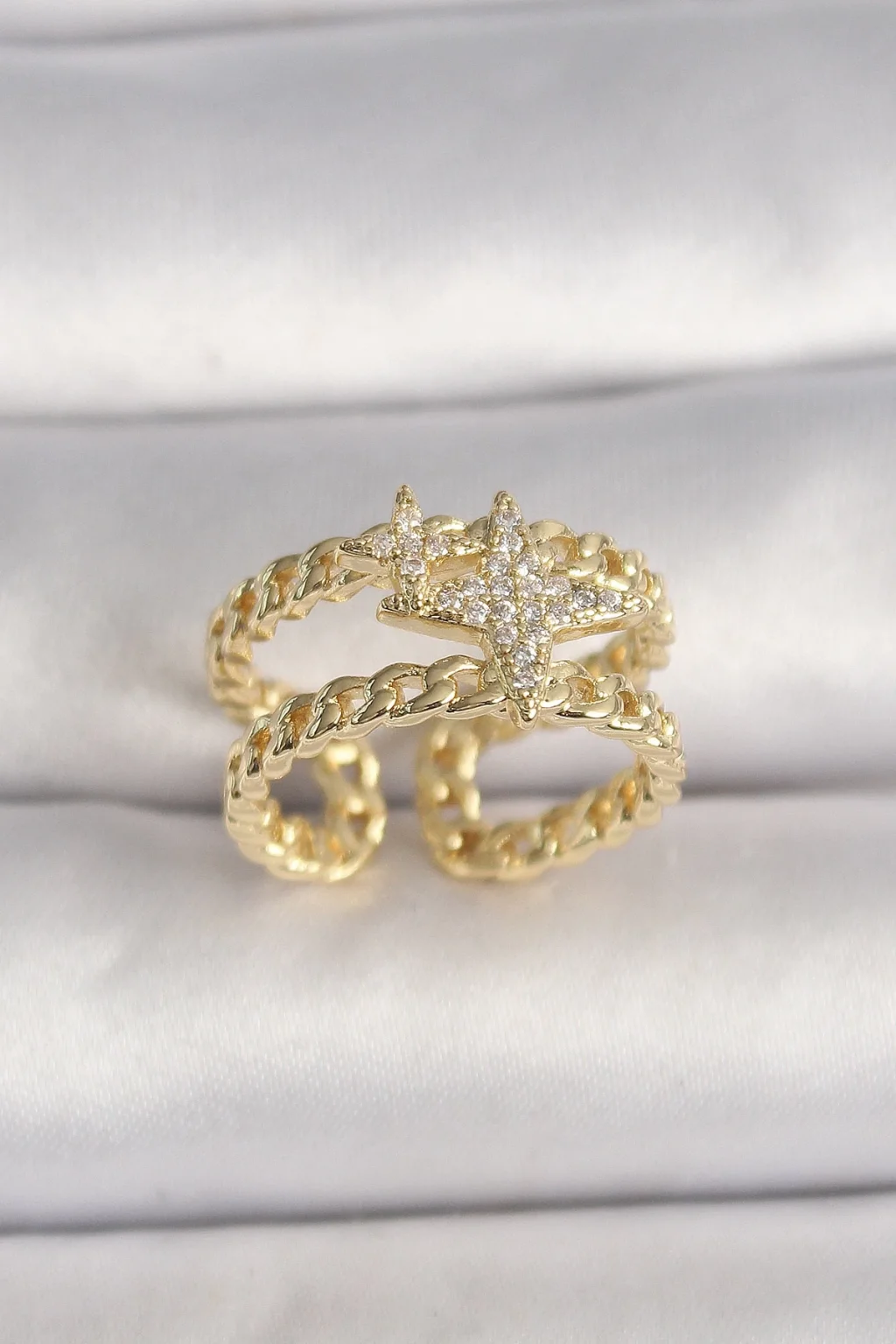 Pirinç Gold Renk 2'Li Zincir Zirkon Taşlı Yıldız Figür Kadın Yüzük