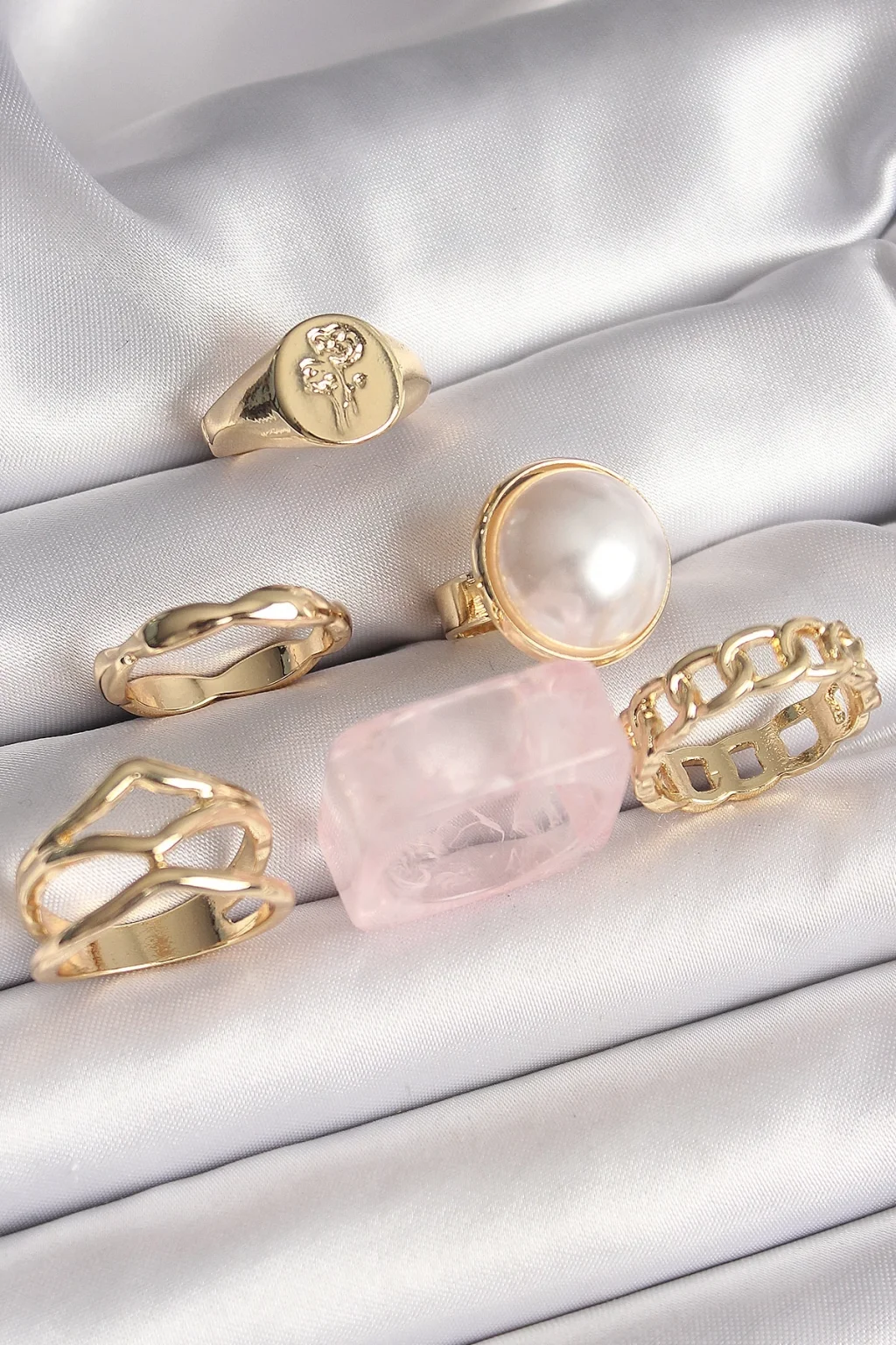 Pirinç Gold Renk Daire 3D İncili Figür Zincir Model Gül İşleme Detaylı 6'Lı Kadın Yüzük Seti