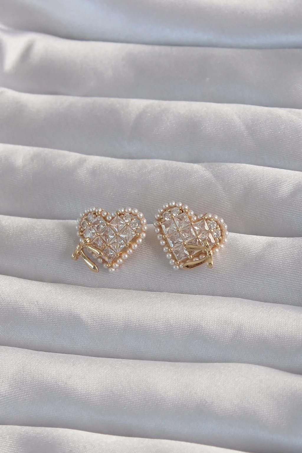 Pirinç Gold Renk Fiyonk Detay İncili Zirkon Taşlı Kalp Küpe