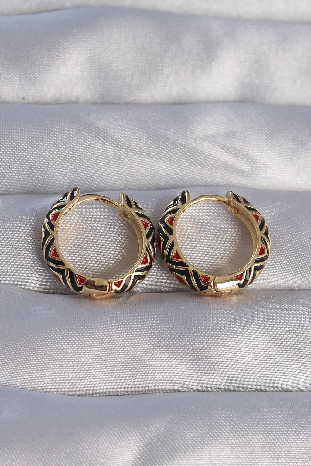 Pirinç Gold Renk Siyah Etnik Desenli Halka Küpe