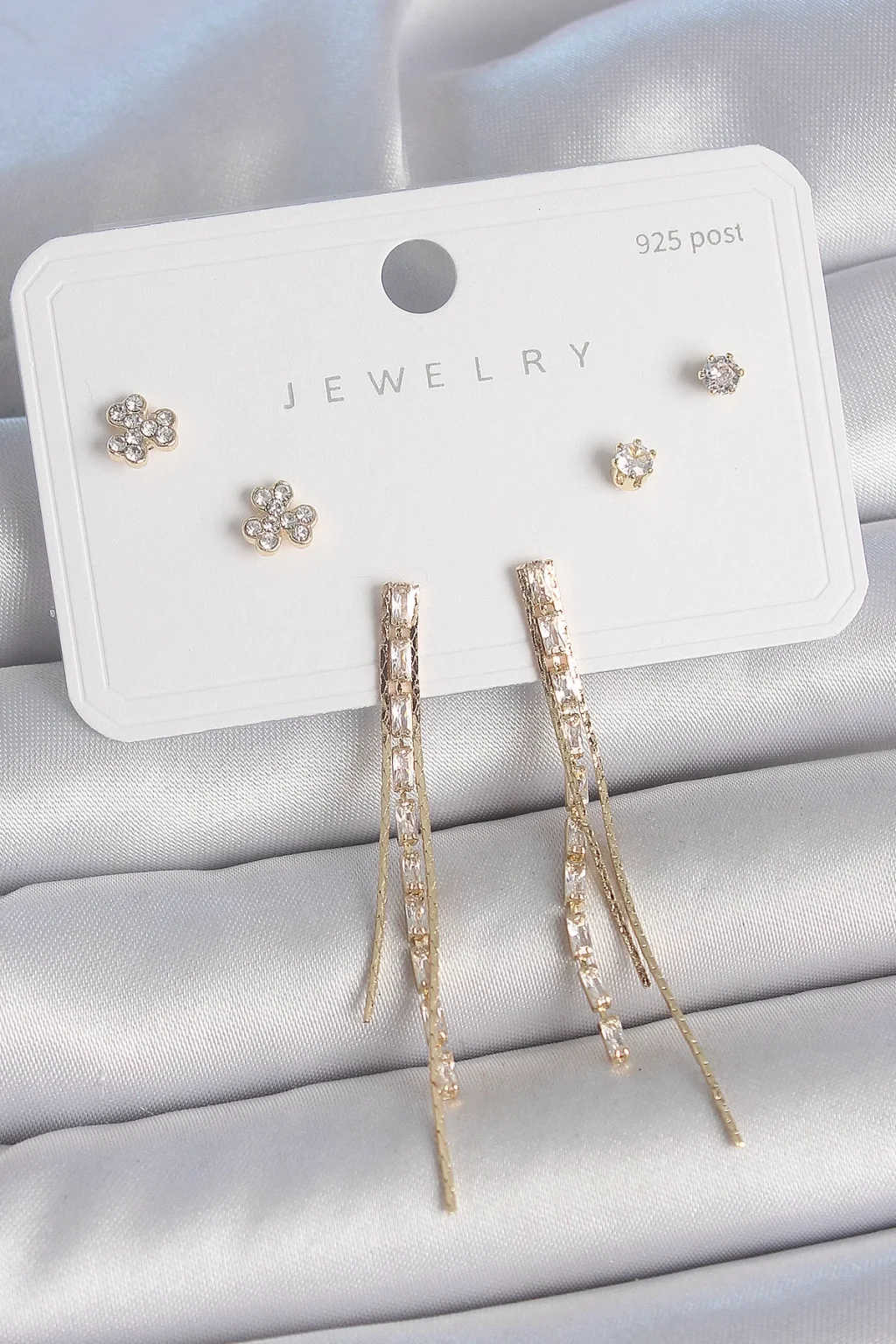 Pirinç Gold Renk Su Yolu Zirkon Taşlı Sallantı Model Çiçek Detay 925 Ayar Gümüş Çivi Kadın Küpe Seti