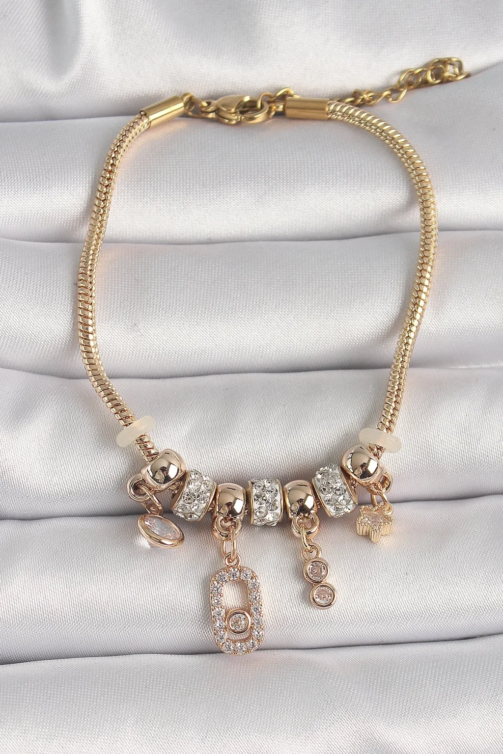 Pirinç Gold Renk Zincir Sallantı Zirkon Taşlı Messika Figür Yıldız Detay Kadın Bileklik