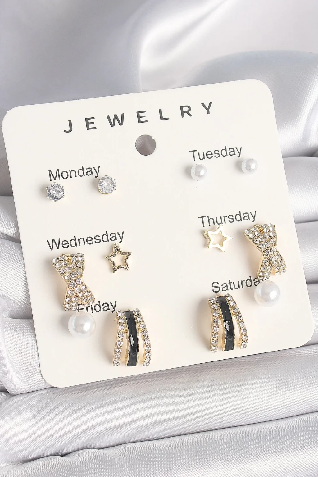 Pirinç Gold Renk Zirkon Taş Yıldız Detaylı İncili 7'Li Set Kadın Küpe Seti