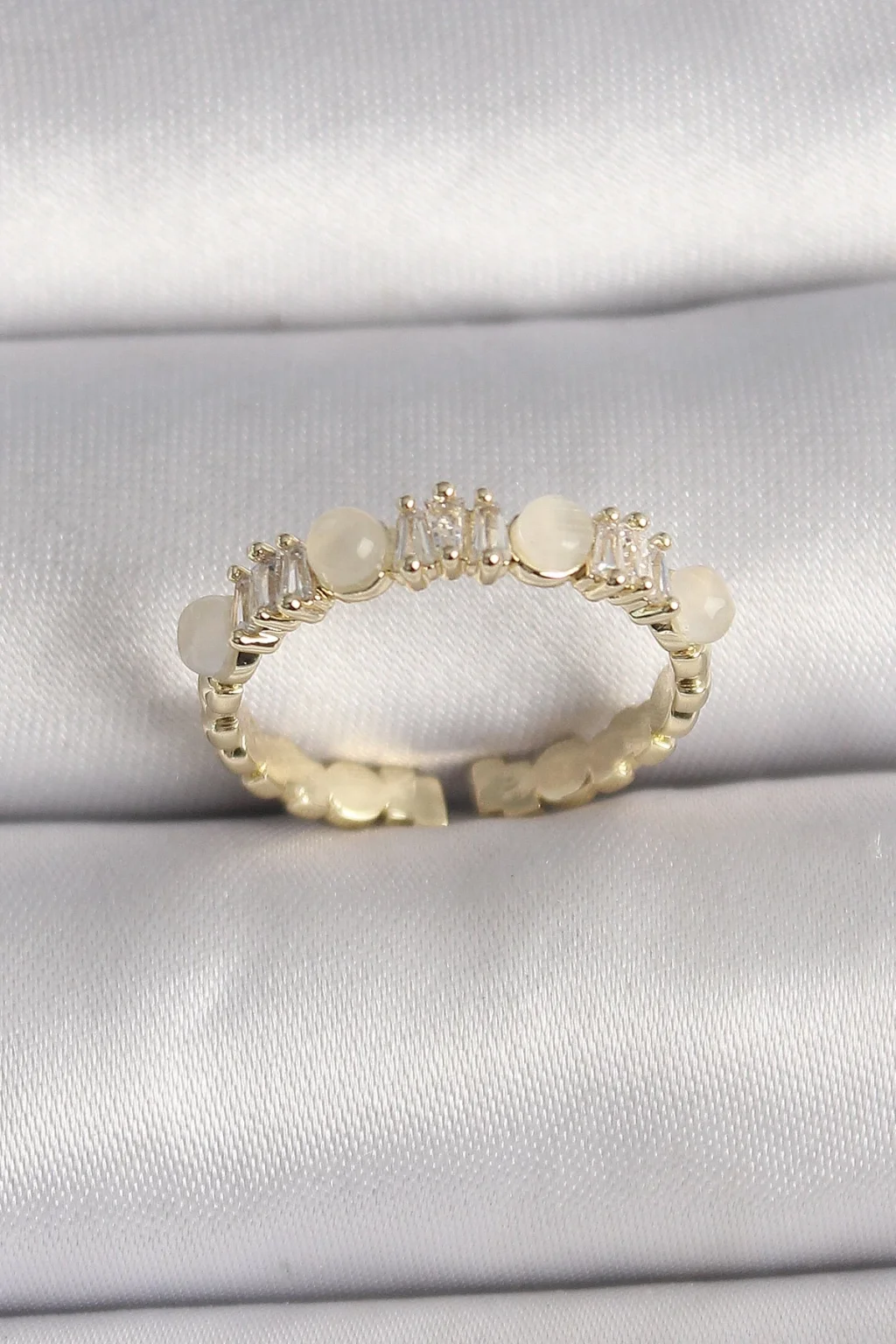Pirinç Gold Renk Zirkon Taşlı Beyaz Mineli Ayarlanabilir Yüzük
