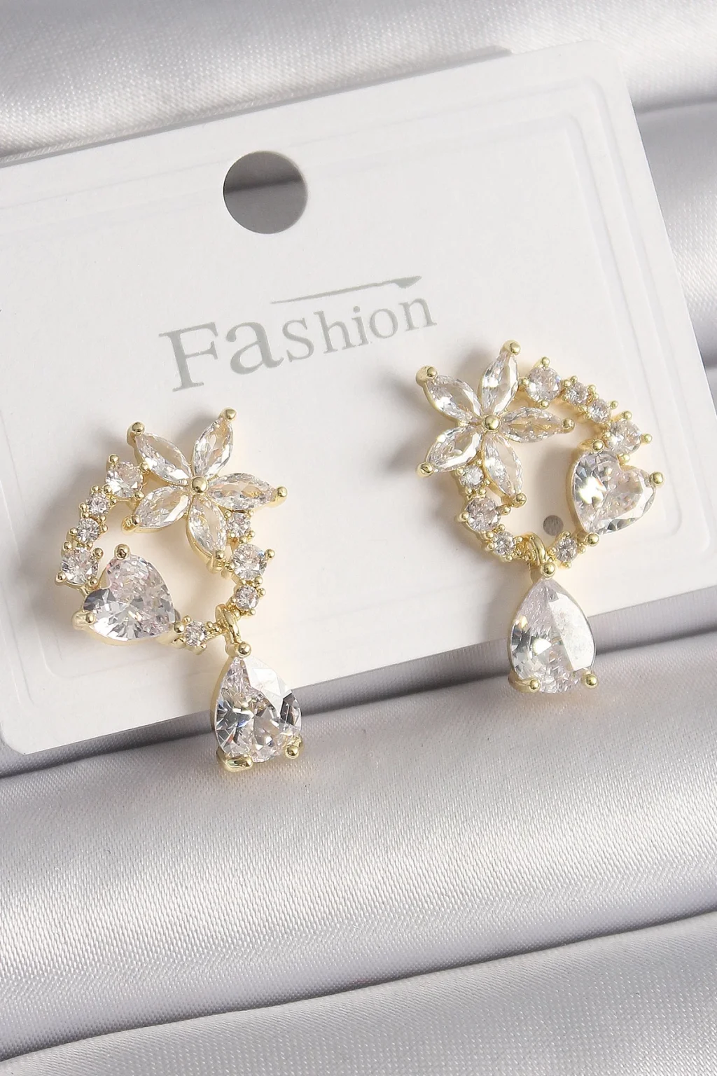 Pirinç Gold Renk Zirkon Taşlı Çiçek Model Sallantı Damla Detay Kadın Küpe