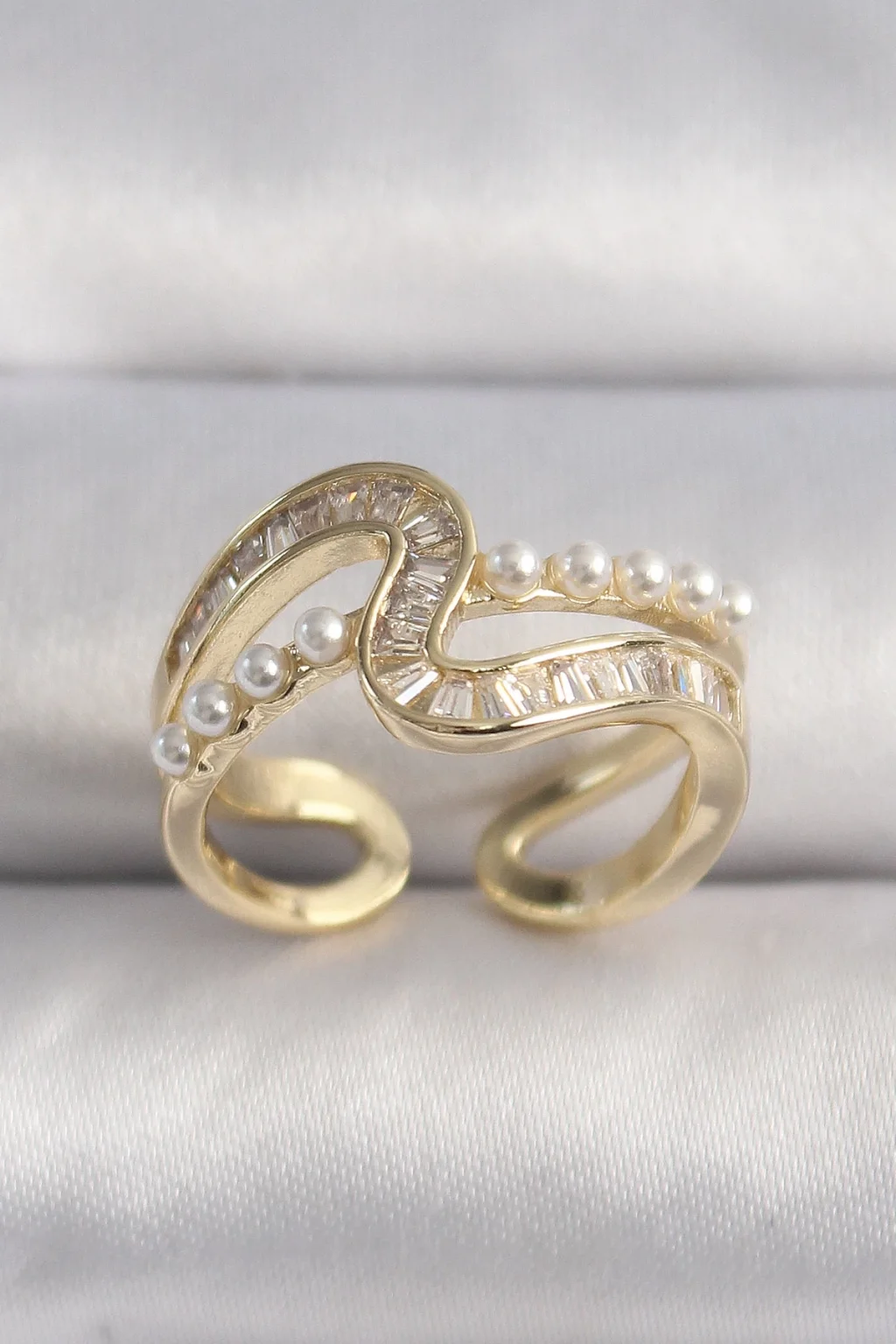 Pirinç Gold Renk Zirkon Taşlı İnci Detay VIP Seri Kadın Yüzük