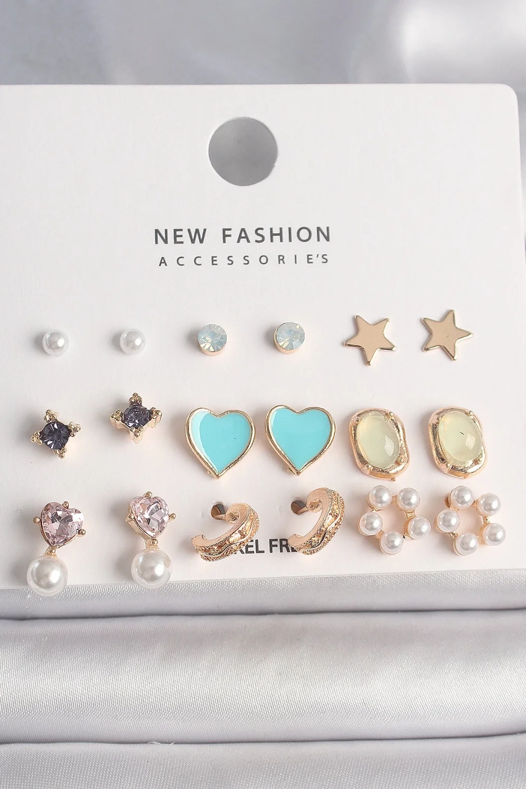 Pirinç Gold Renk Zirkon Taşlı İncili Çiçek Mavi Kalp Figür 9 Çift Kadın Küpe Seti