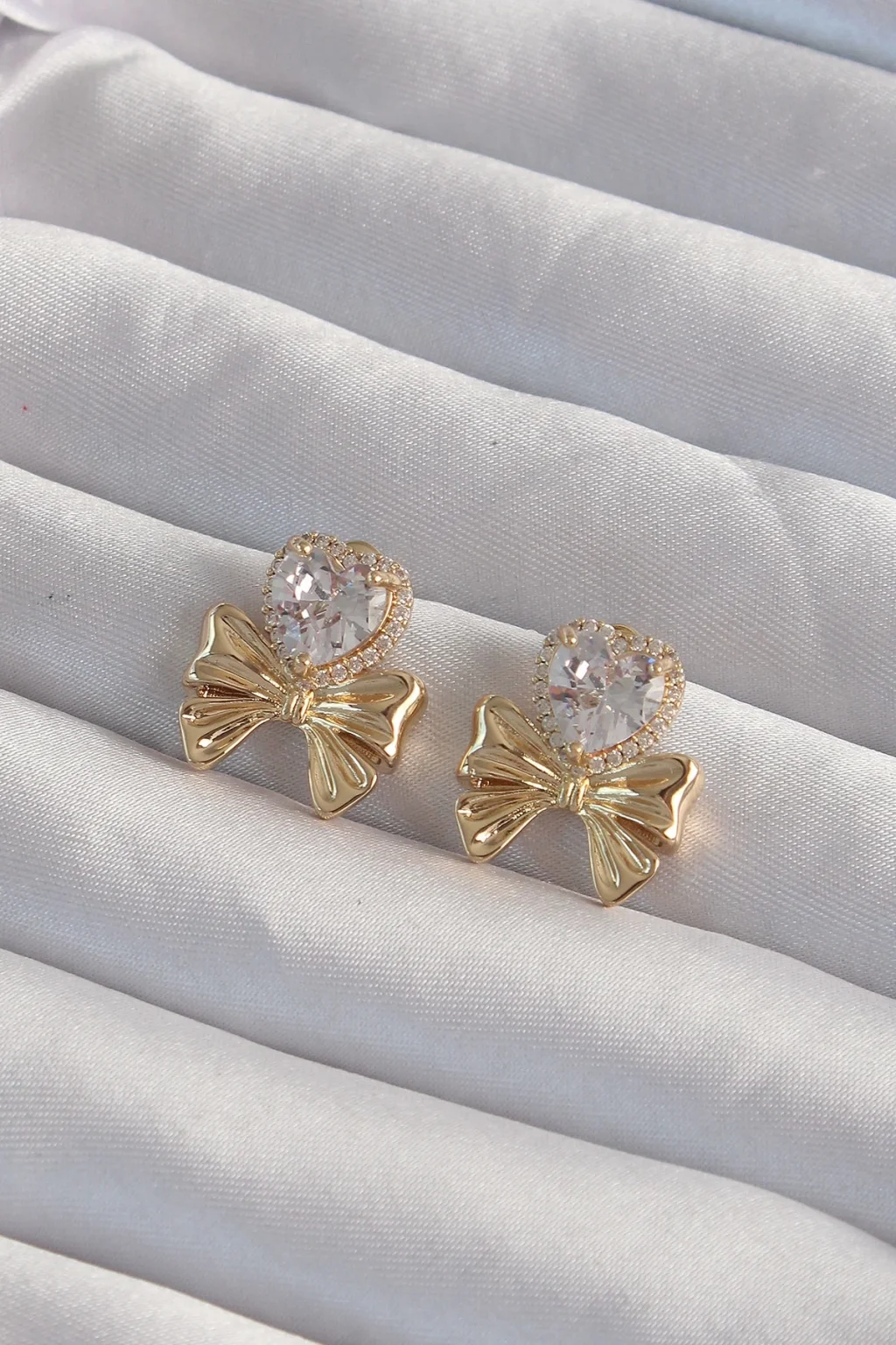 Pirinç Gold Renk Zirkon Taşlı Kalp Model Fiyonk Küpe