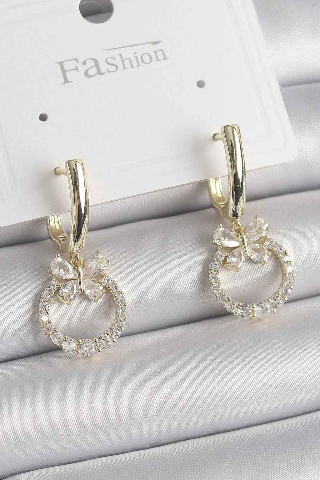 Pirinç Gold Renk Zirkon Taşlı Kelebek Figür Sallantı Model Kadın Küpe