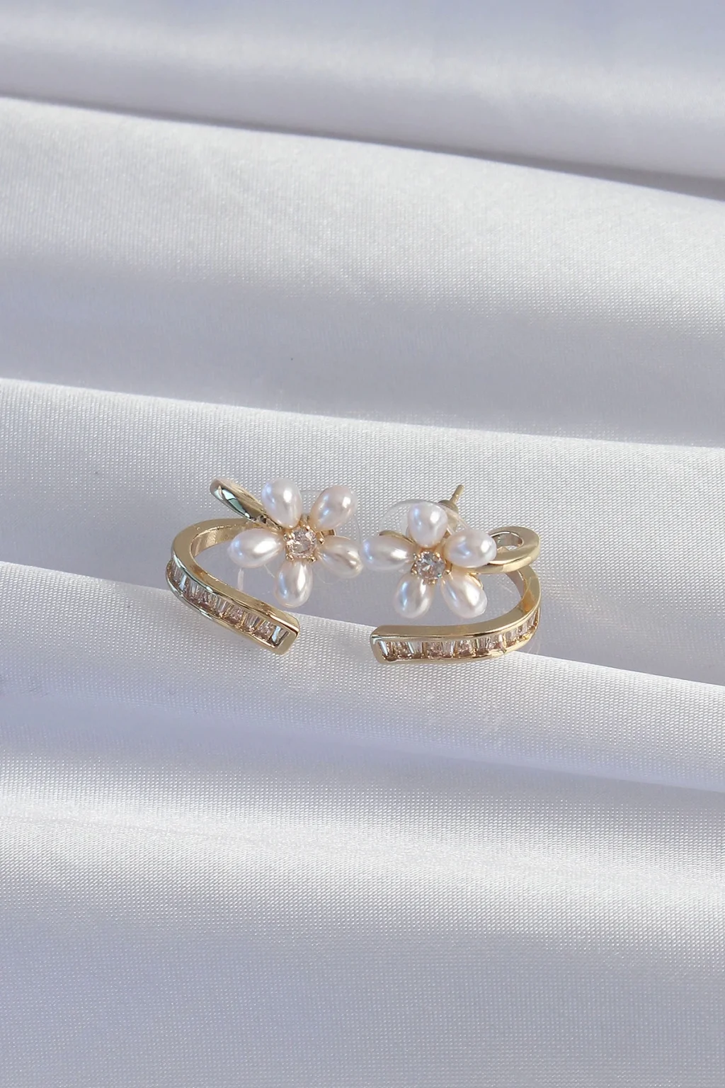 Pirinç Gold Renk Zirkon Taşlı Kıvrımlı İnci Çiçek Küpe