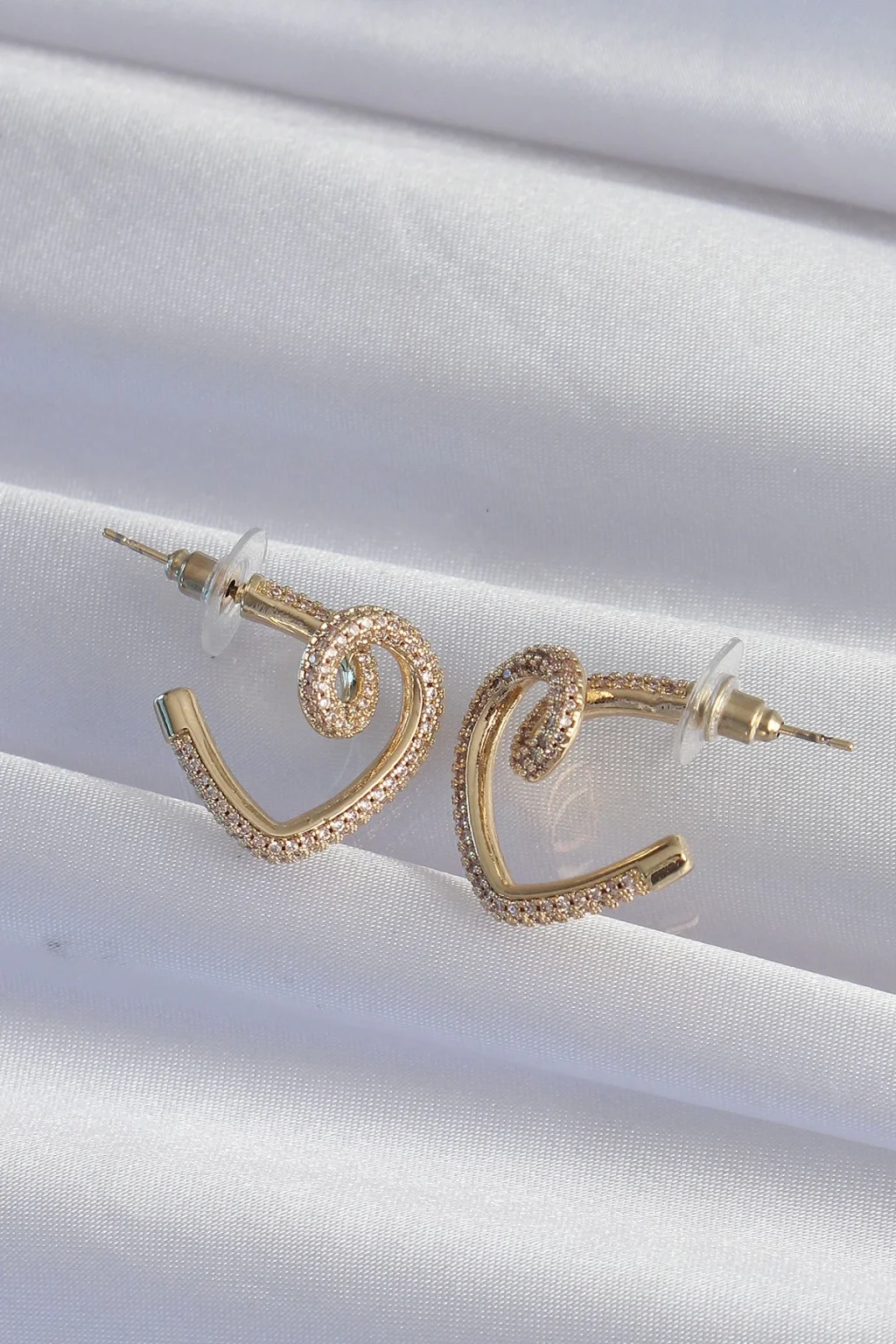 Pirinç Gold Renk Zirkon Taşlı Kıvrımlı Yarım Kalp Küpe