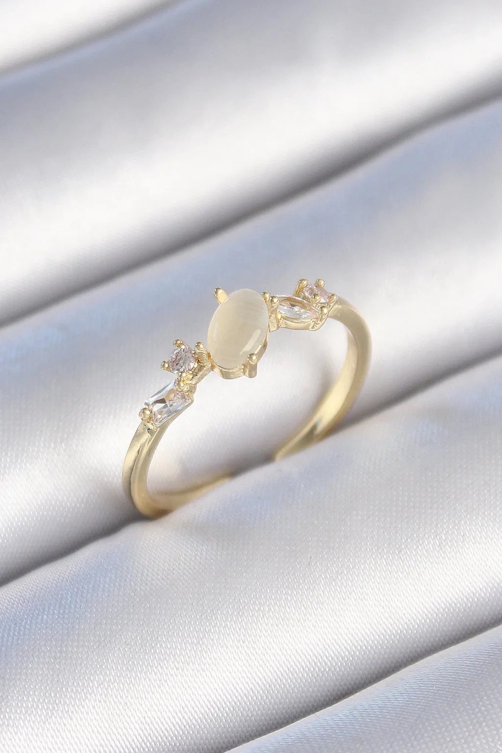 Pirinç Gold Renk Zirkon Taşlı Oval Beyaz Mineli Kadın Yüzük