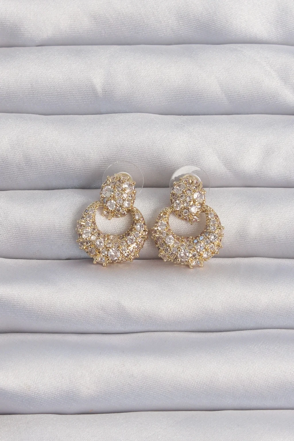 Pirinç Gold Renk Zirkon Taşlı Oval Form Küpe