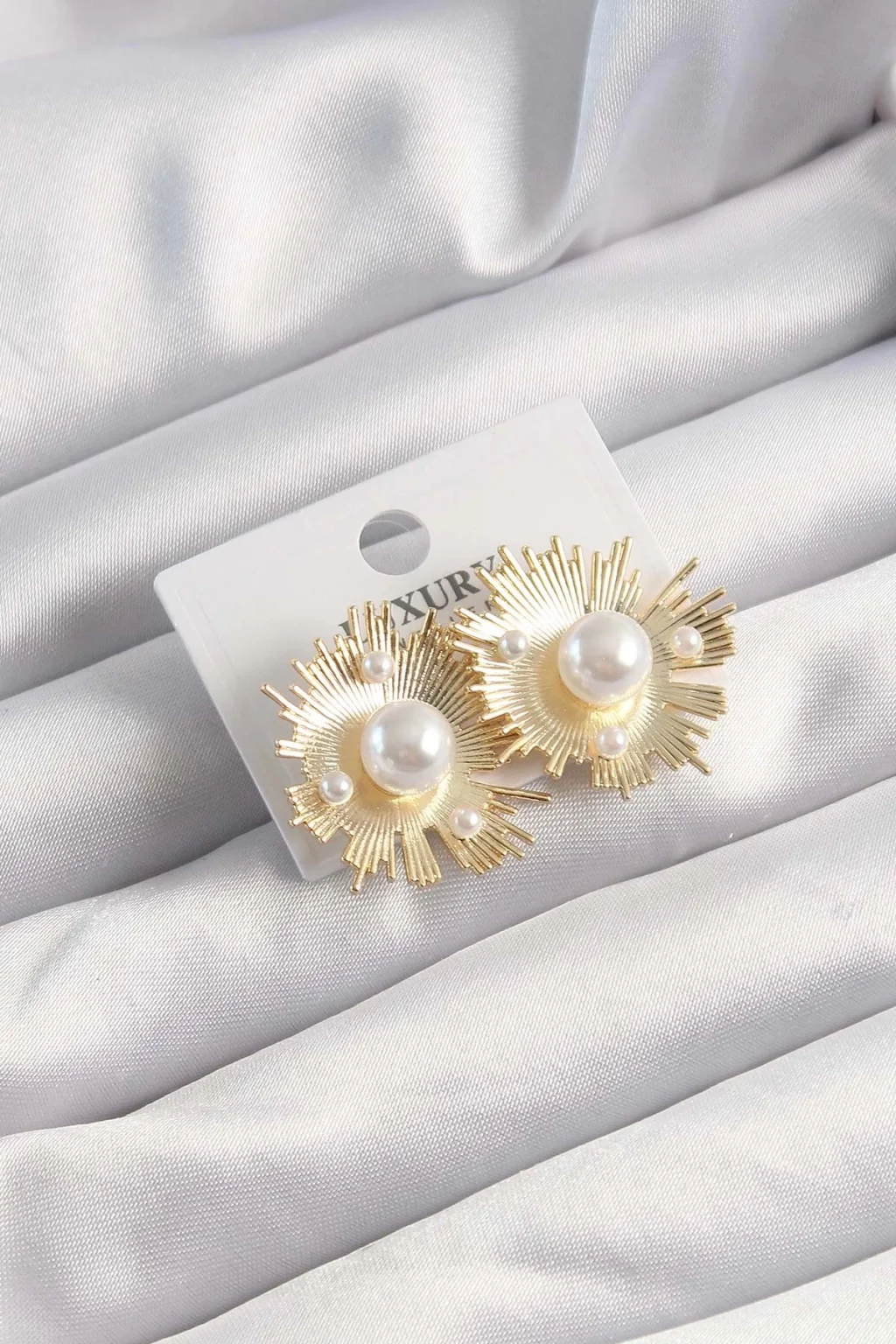 Pirinç Gold Renk Zirkon Taşlı Parlayan İnci Taneleri Küpe