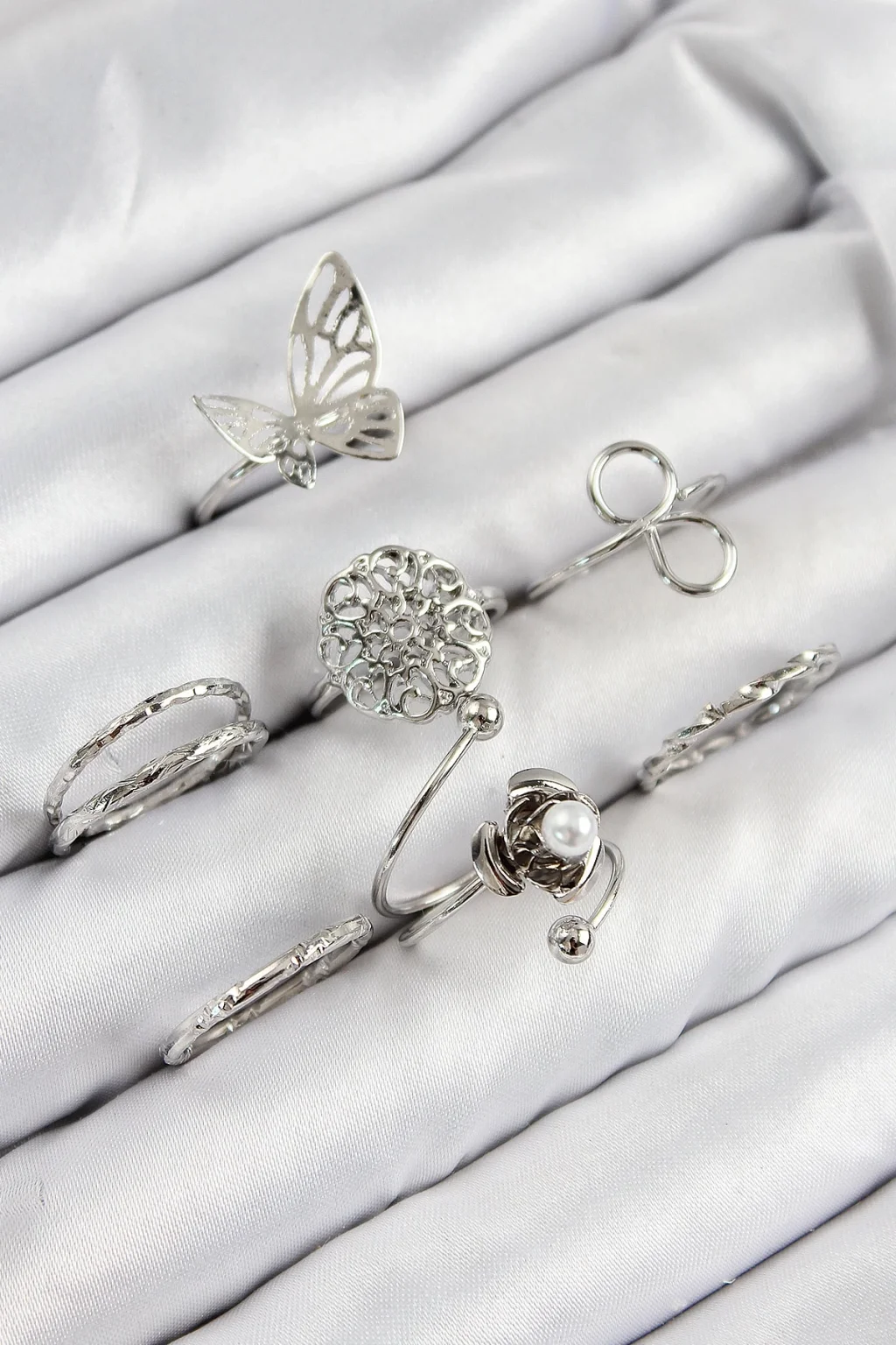 Pirinç Gül Kelebek Model Gümüş Renk Kadın Yüzük Kombin Set