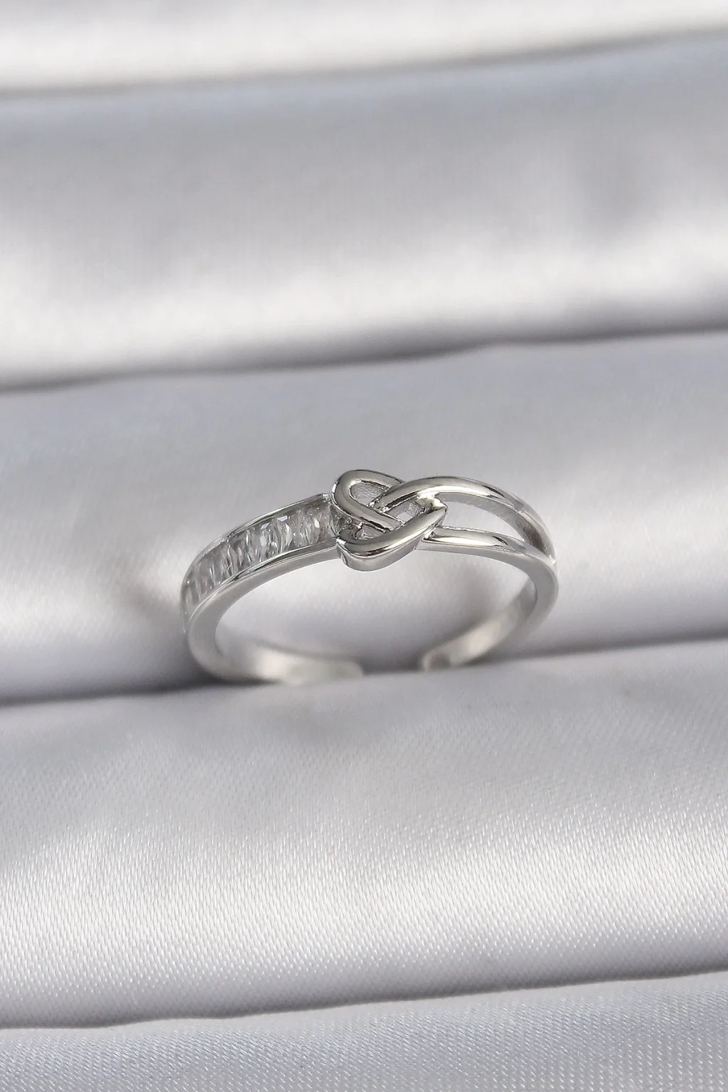 Pirinç Gümüş Renk Ayarlanabilir Zirkon Taşlı Düğüm Kalp Model Kadın Yüzük