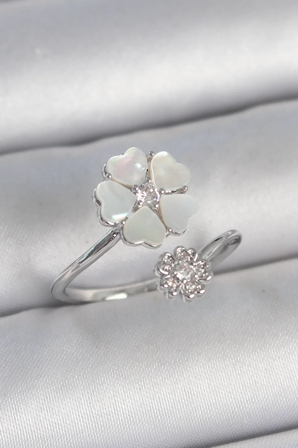 Pirinç Gümüş Renk Beyaz Mineli Çiçek Model Zirkon Taş Detay Kadın Yüzük