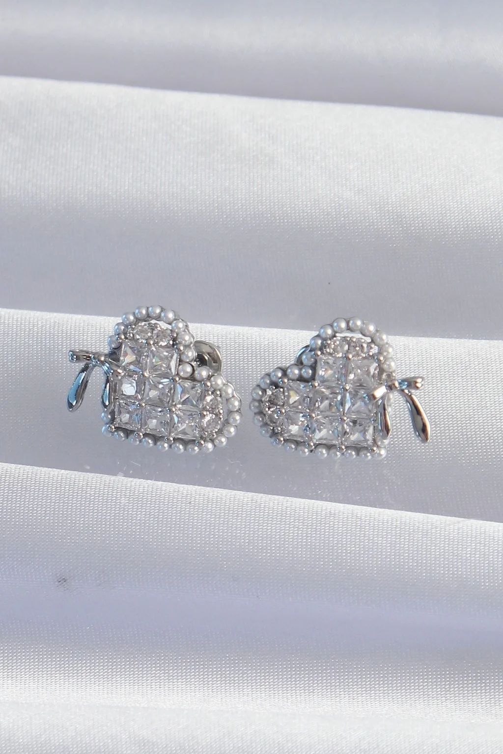 Pirinç Gümüş Renk Fiyonk Detay İncili Zirkon Taşlı Kalp Küpe