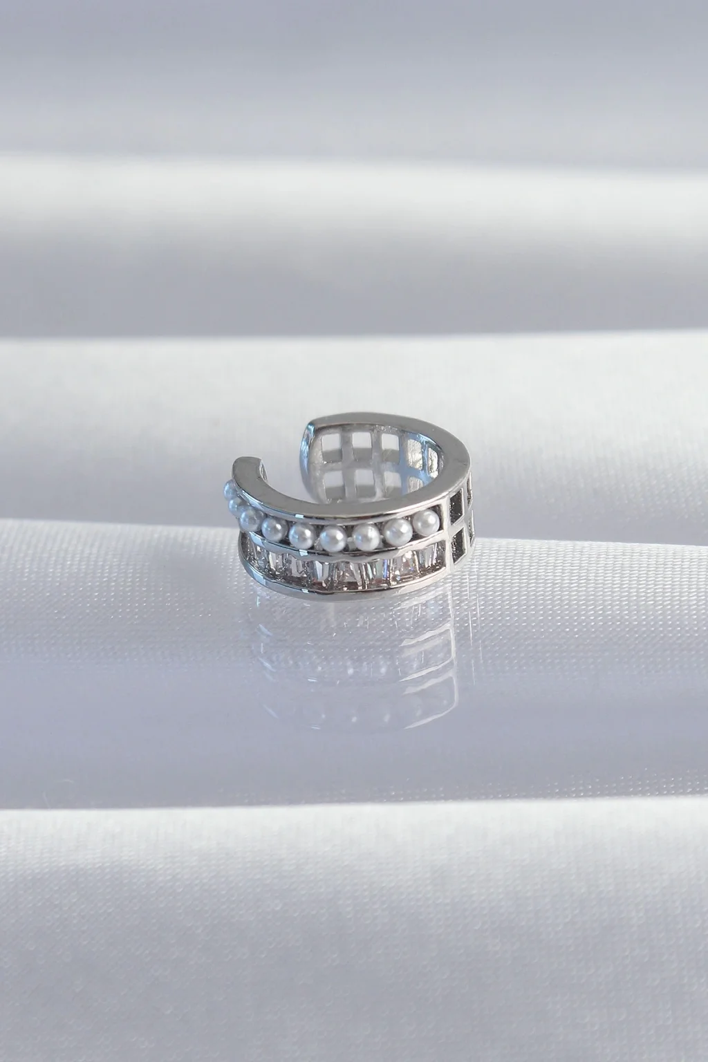 Pirinç Gümüş Renk İncili Baget Taşlı Earcuff Küpe