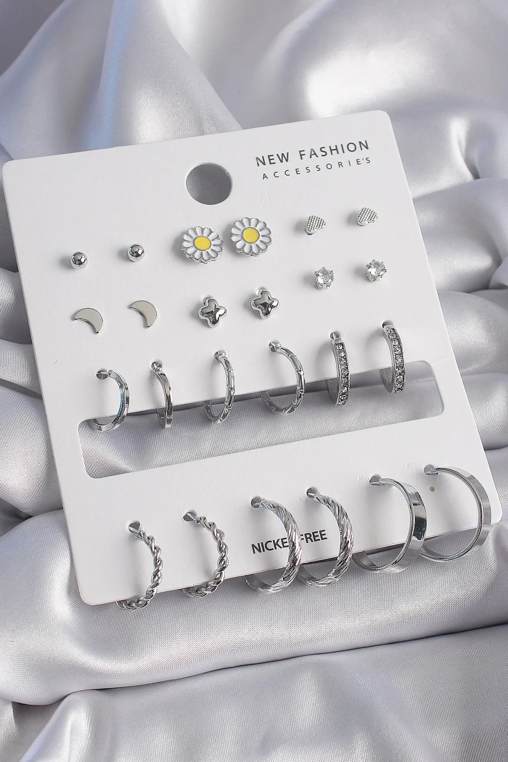 Pirinç Gümüş Renk Papatya Detaylı 12 Çiftli Kadın Küpe Seti