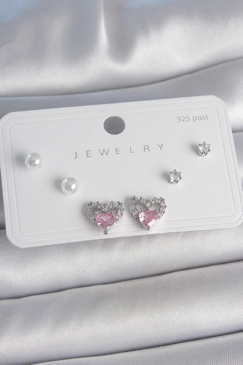 Pirinç Gümüş Renk Pembe Zirkon Taşlı Kalp Model İnci Detay 925 Ayar Gümüş Çivi Kadın Küpe Seti