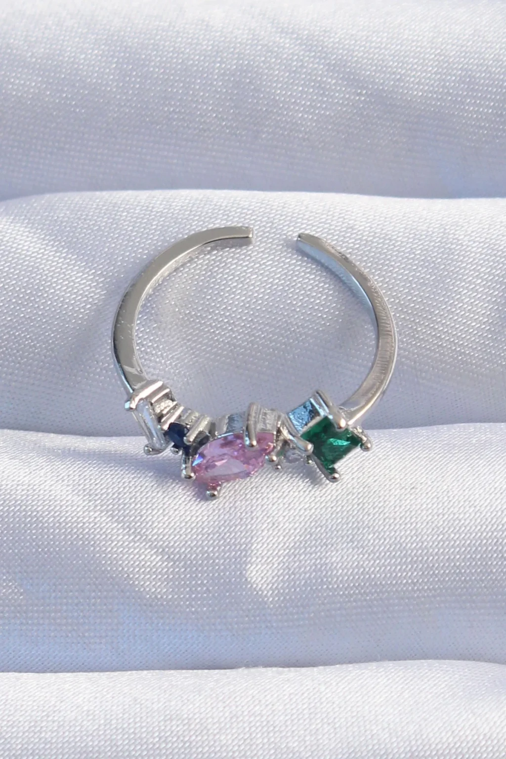 Pirinç Gümüş Renk Renkli Zirkon Taşlı Ayarlanabilir Yüzük