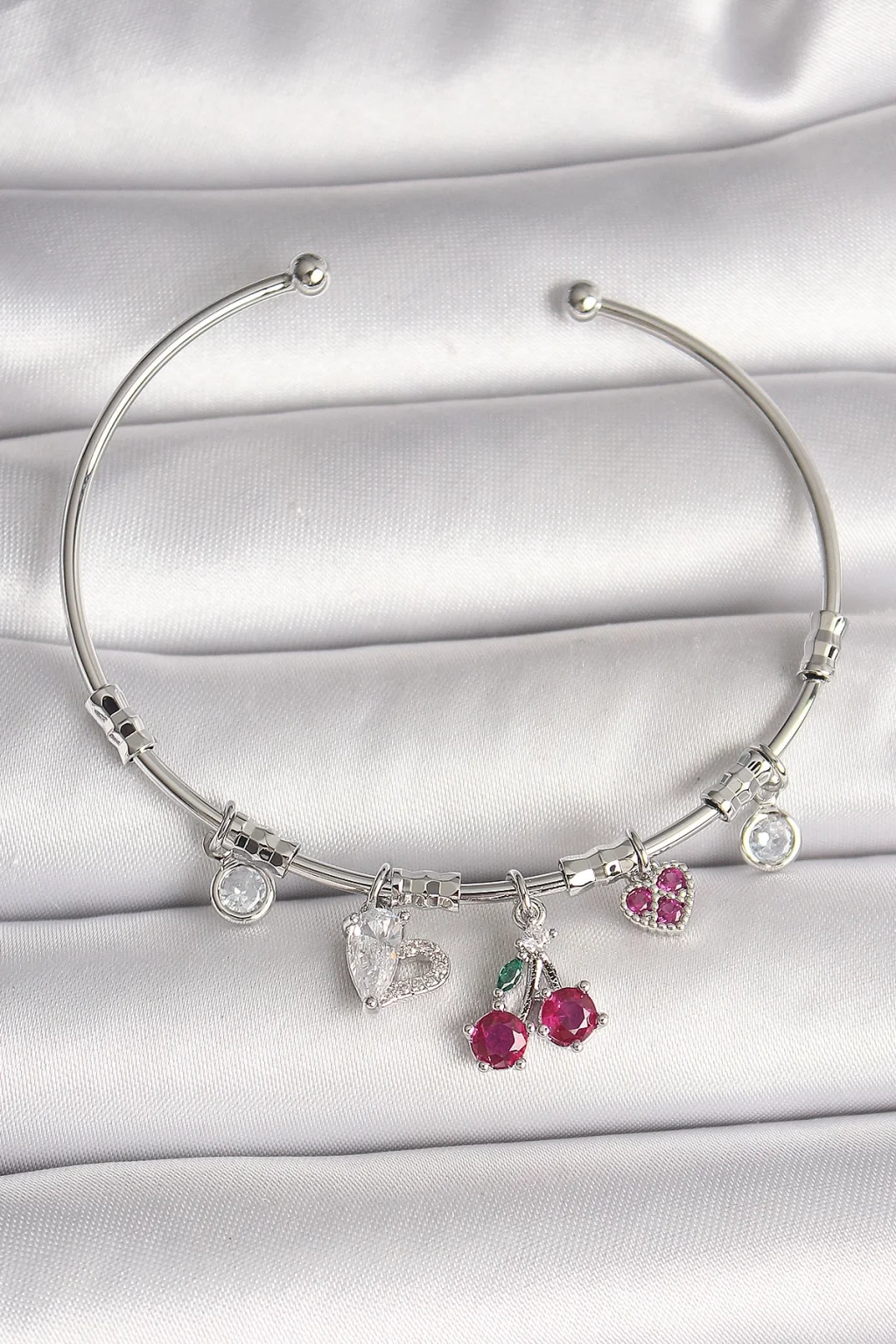 Pirinç Gümüş Renk Sallantı Kiraz Figür Kalp Detay Charm Kadın Bileklik
