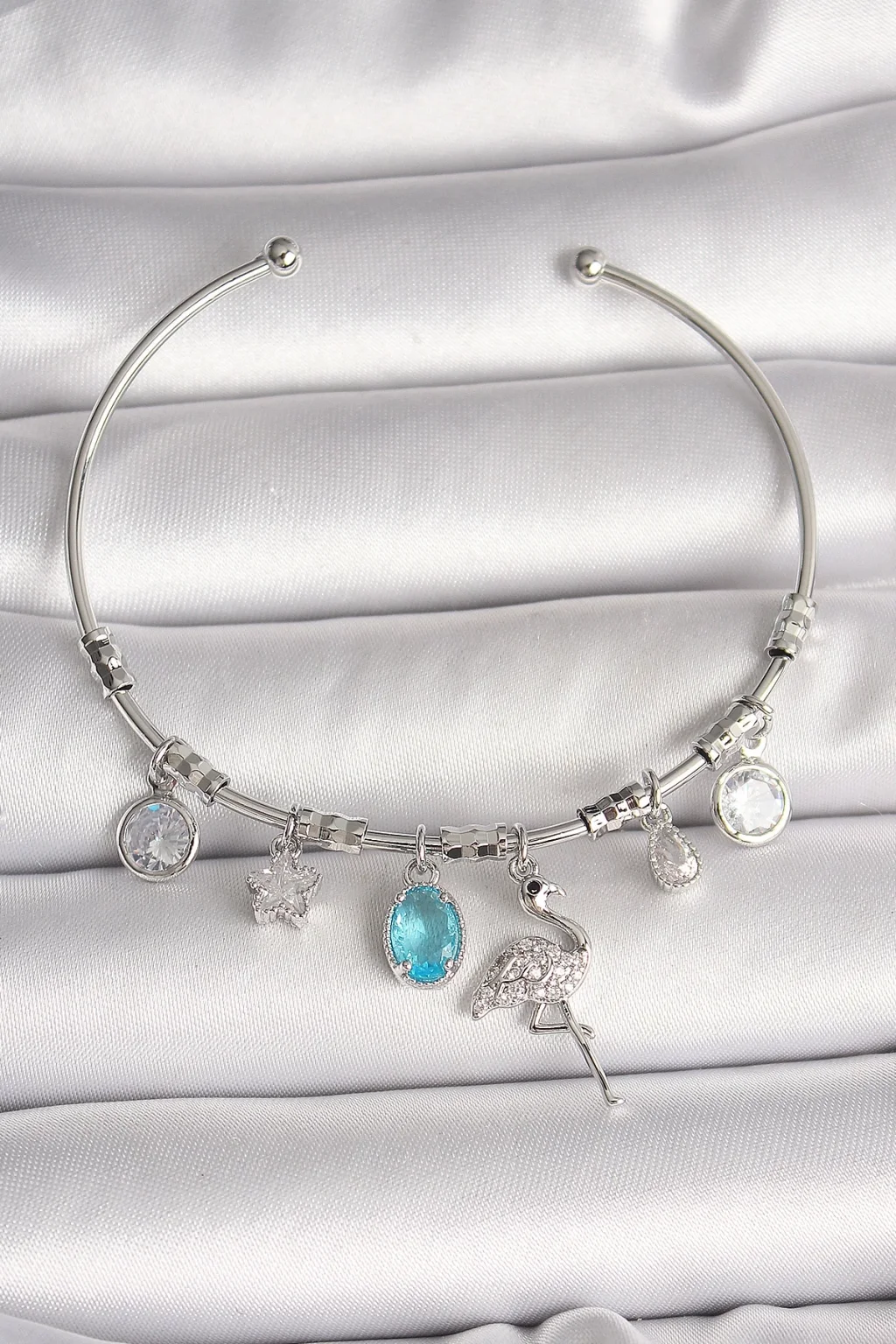 Pirinç Gümüş Renk Sallantı Zirkon Taşlı Filaminga Figür Charm Kadın Bileklik
