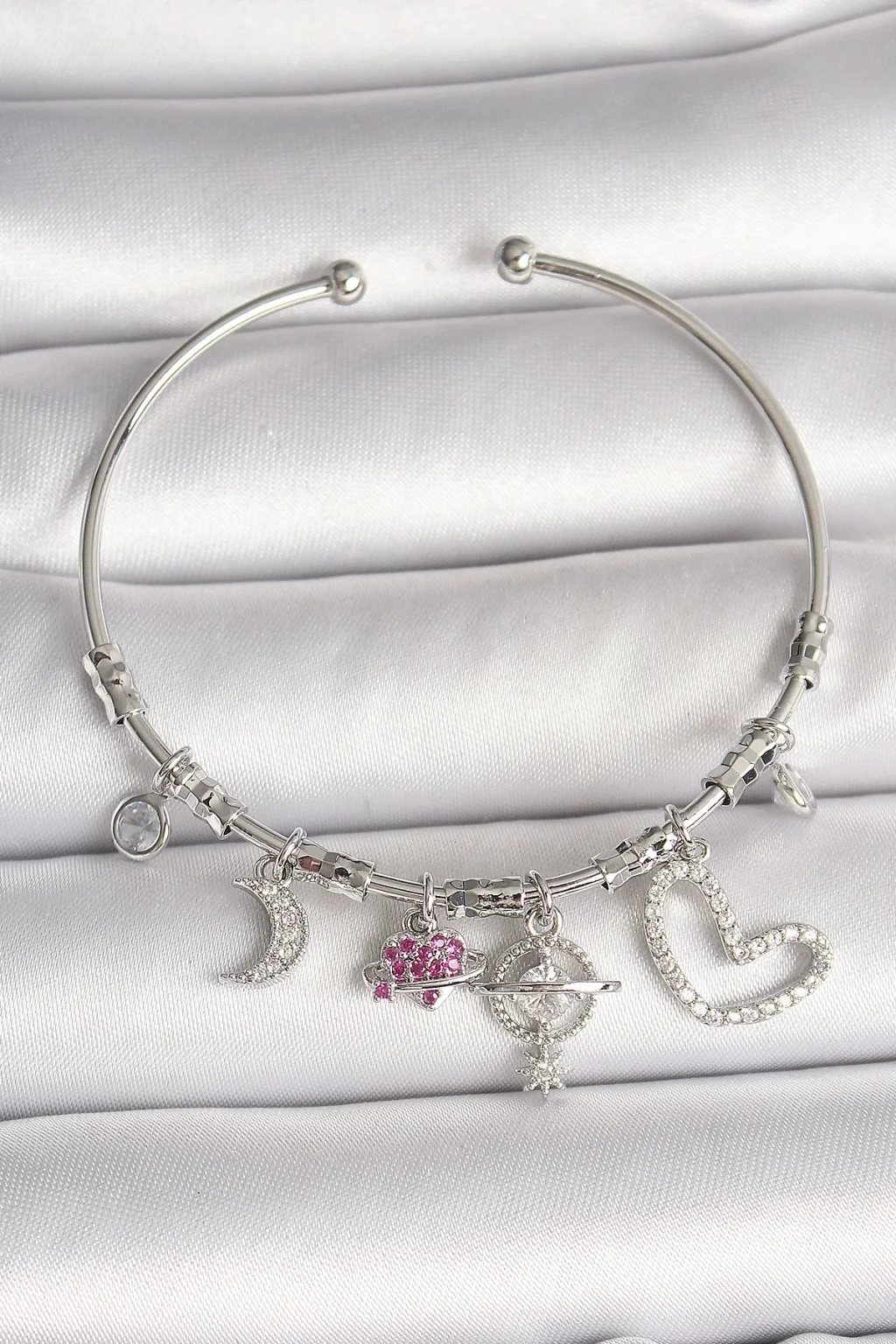 Pirinç Gümüş Renk Sallantı Zirkon Taşlı Gezegen Figür Kalp Detay Charm Kadın Bileklik