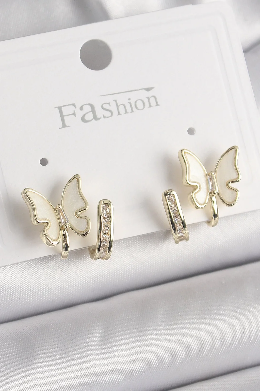 Pirinç Gümüş Renk Zirkon Taş Detaylı Beyaz Sedefli Kelebek Model Kadın Küpe