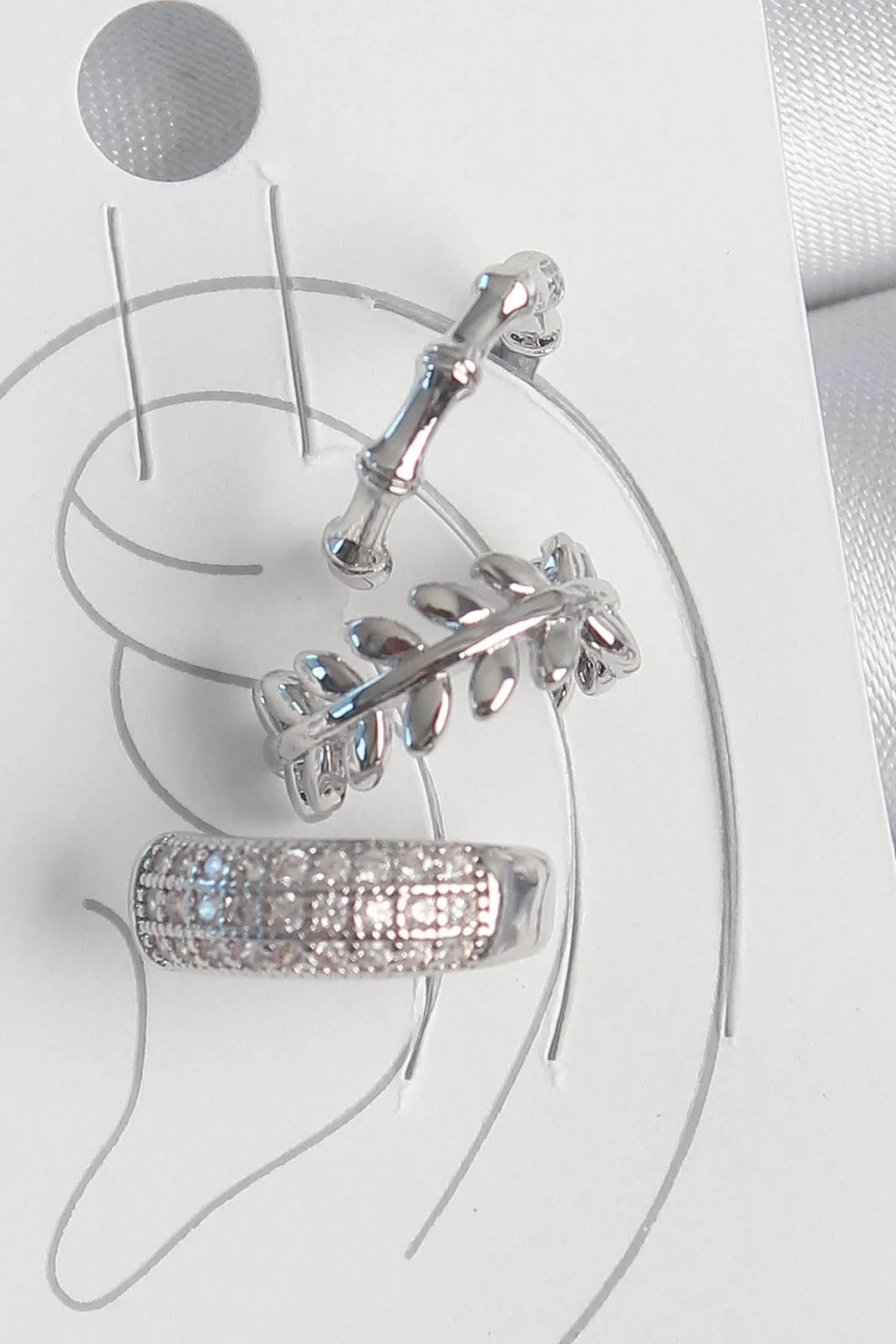 Pirinç Gümüş Renk Zirkon Taşlı 3'Lü Model Yaprak Figür Kadın Kıkırdak Küpe