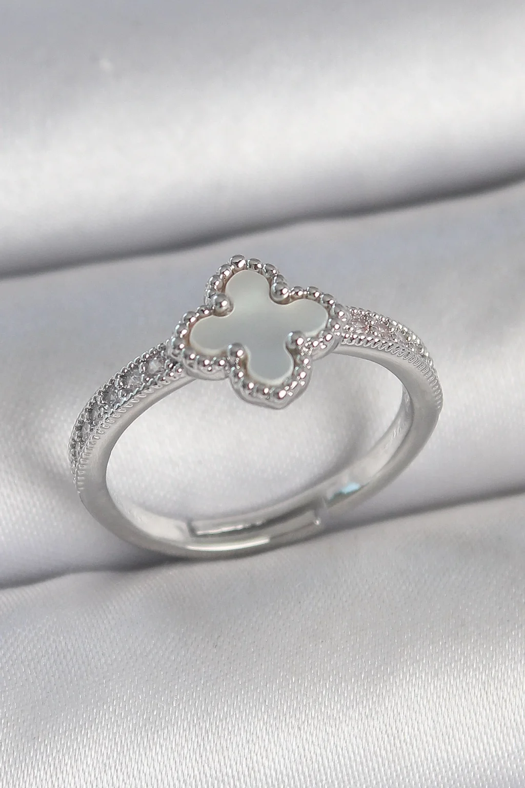Pirinç Gümüş Renk Zirkon Taşlı Beyaz Mineli Yonca Model Ayarlanabilir Kadın Yüzük