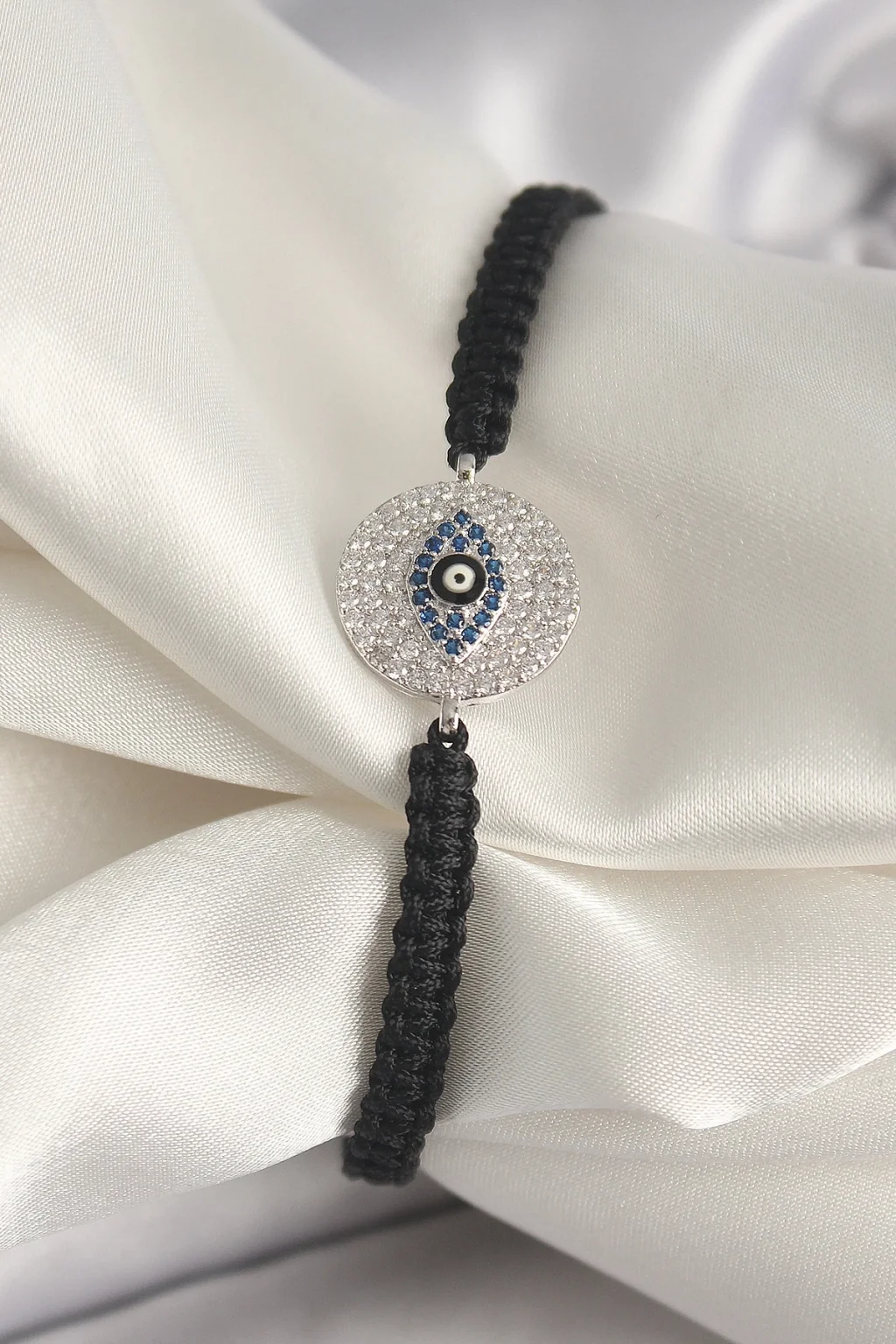 Pirinç Gümüş Renk Zirkon Taşlı Göz İşlemeli Figür Asansörlü Makrome Model Kadın Bileklik