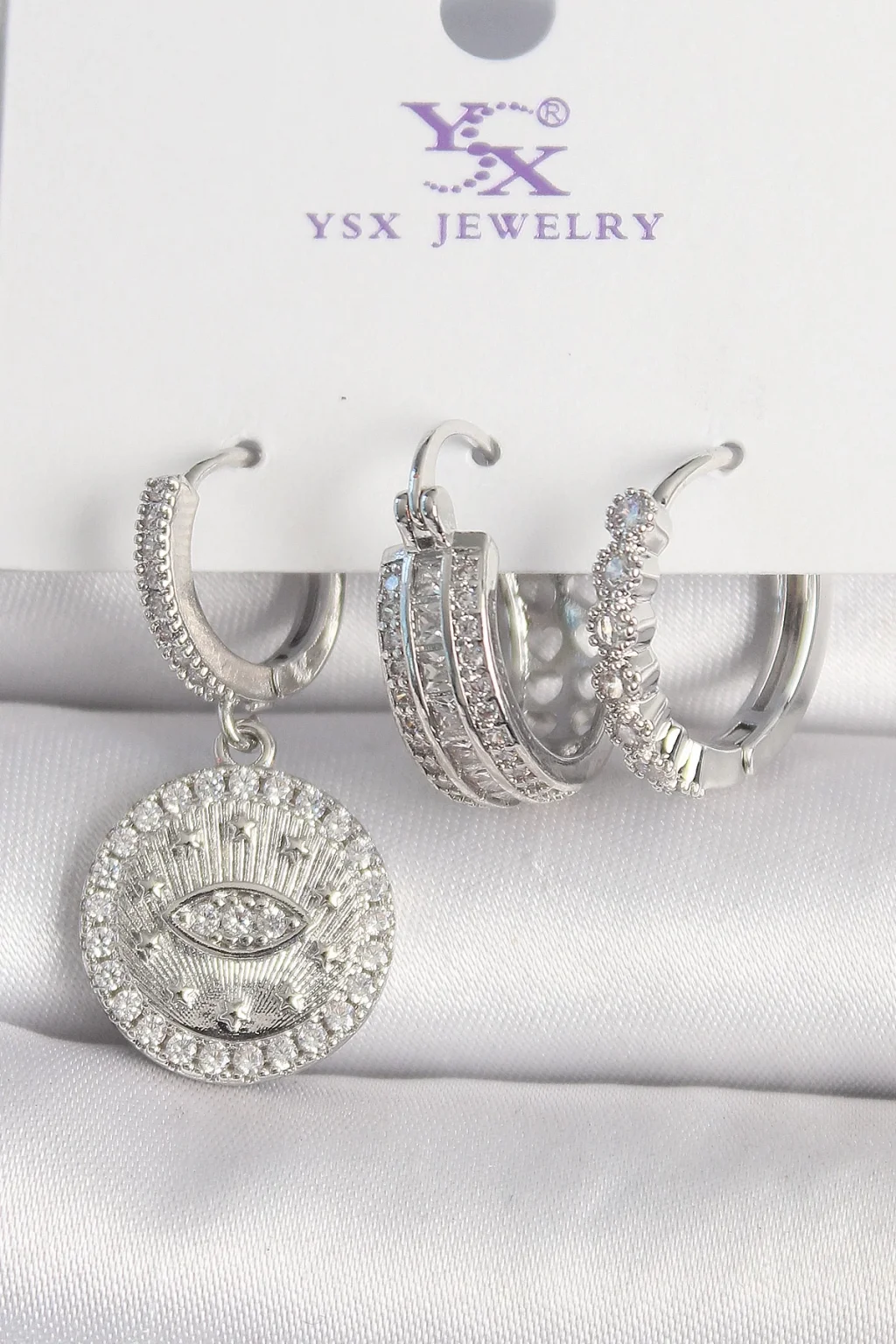 Pirinç Gümüş Renk Zirkon Taşlı Göz İşlemeli Halka Model 3'Lü Kadın Kombin Küpe