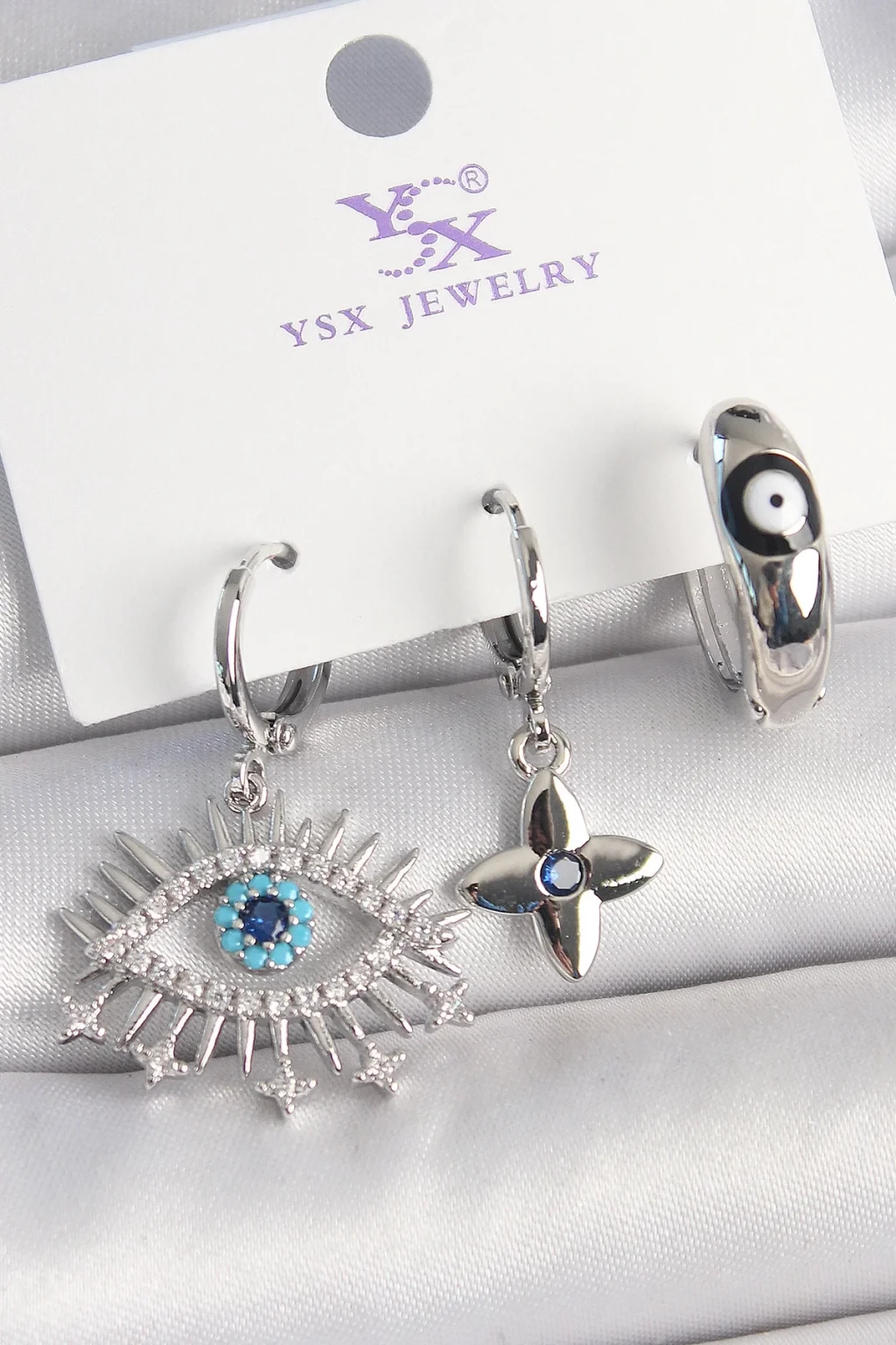 Pirinç Gümüş Renk Zirkon Taşlı Göz Model Nazar Boncuk Detay 3'Lü Kadın Kombin Küpe