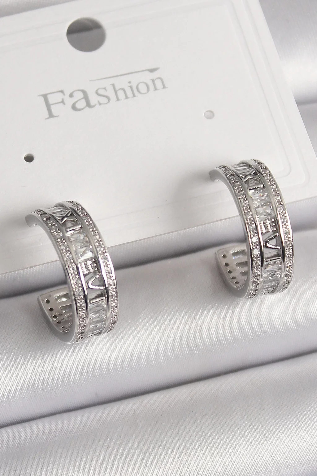 Pirinç Gümüş Renk Zirkon Taşlı İşleme Detay Halka Model Kadın Küpe