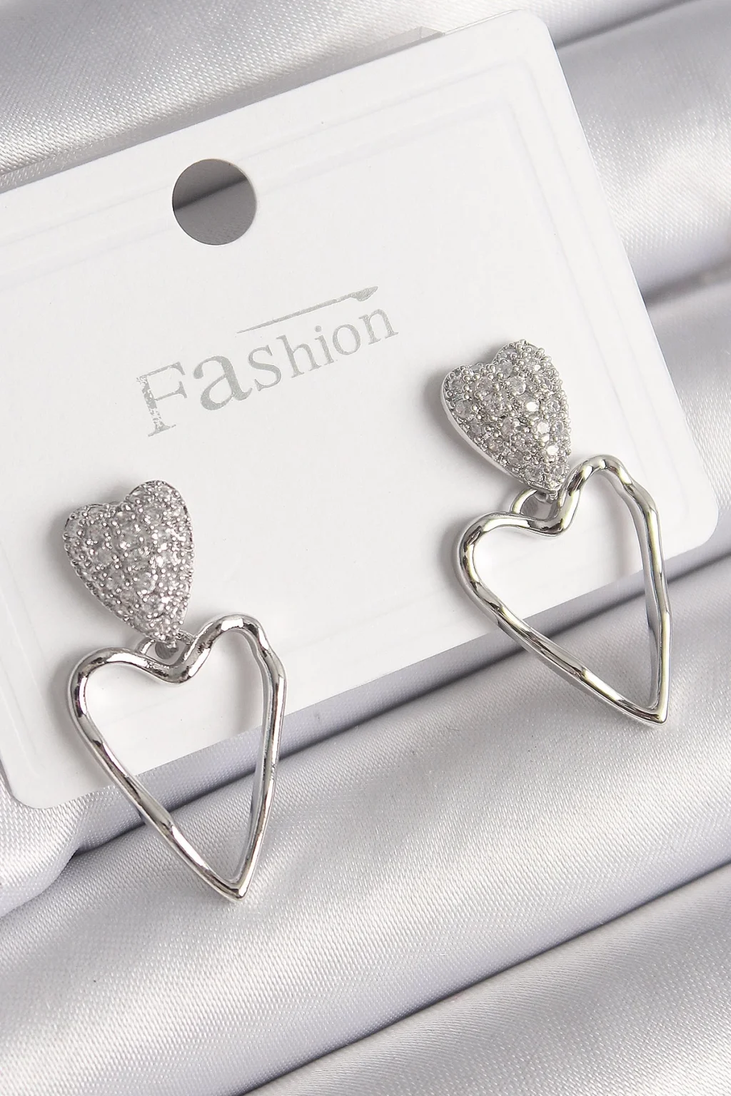 Pirinç Gümüş Renk Zirkon Taşlı Kalp Model Kadın Küpe