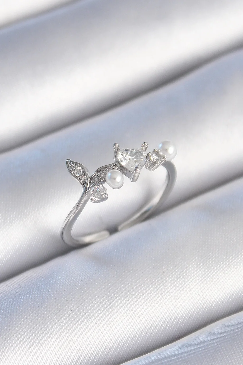 Pirinç Gümüş Renk Zirkon Taşlı Kalp Yaprak Model İnci Detay Kadın Yüzük