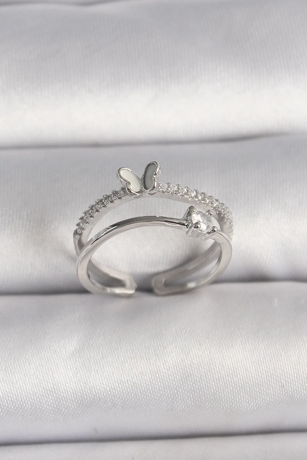Pirinç Gümüş Renk Zirkon Taşlı Kelebek Figürlü Ayarlanabilir Yüzük